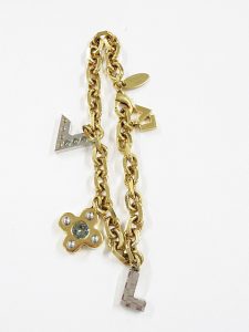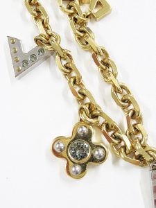 須賀質店池袋営業所で、ルイヴィトン、ブラスレラブレターズのブレスレットを買取いたしました。M75410型という型番のお品物で、ファインジュエリーと呼ばれる貴金属を使用したものでは無く、アクセサリーと呼ばれるような金色にメッキ加工されたブレスレットです。喜平のような形のブレスレットの途中にいくつかチャームが付いていて、チャームにはラインストーンが入っていました。こちらも天然の宝石を使用しているものでは無く、人工の石を使用していました。