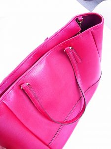 今回のお品物は、コーチのトートバッグです。皮革工房からスタートしたコーチらしい、レザー素材のバッグで、サフィアーノと呼ばれる素材を使用しています。サフィーノという素材はプラダが好んで使用する素材で、プラダで開発されたという説もあります。表面がしっかりと加工されているため、水に弱いという革の弱点を克服し、型押しの模様や艶に高級感のある素材です。