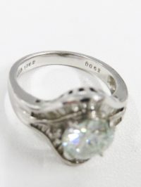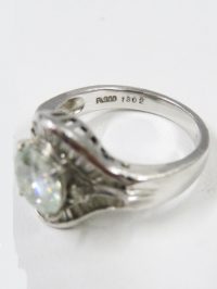 こちらの指輪に付いている透明の石は、ダイヤモンドに似せた類似石で「合成モアッサナイト」と呼ばれる石です。宝石としての価値は、ダイヤモンドが数万円から高価なものは千万円単位の価値になるものもある反面、この合成モアッサナイトの価値は限りなく0円です。