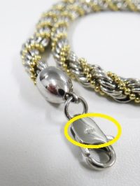 こちらのネックレスですが、冠の部分にプラチナ、金の表示である記号が打ち込まれています。Pt900⇒プラチナが90%含まれている、750⇒金が75%の割合で含まれている18金である、という意味ですね。とうぜん、皆さんはこのネックレスは貴金属で出来ている、と思いますよね。
