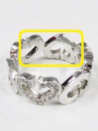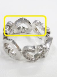 こちらの画像は、カルティエCハートリングの模造品です。先にご説明したアントルラセリングと同様にCARTIERの刻印、18金であることを表す750の刻印、サイズを表記する51の刻印が見えます。NP8301というシリアル番号の刻印もはっきりと見えますね。