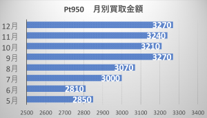 今回買取した指輪の素材はプラチナが95%以上の純度があるPt950と呼ばれる素材のものであったため、Pt950の買取金額を月別で表しました。