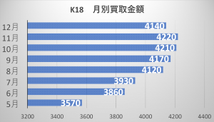 18金の買取金額はPt950よりも上昇率が高く、5月~12月までの価格を見ると、5月に買取金額3,570円に対して11月は4,220円と650円もの差があります。
