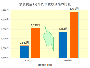 お品物を買取した1月22日で、2019年と2020年の須賀質店の買取価格を比較してみましょう。