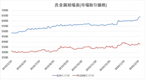 以下のグラフは、24金インゴットとPt1000インゴットの市場取引価格の推移です。