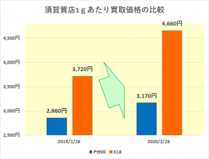 お品物を買取した2月26日で、2019年と2020年の須賀質店の買取価格を比較してみました。