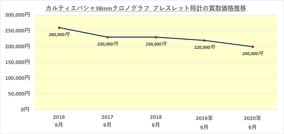 下のグラフはパシャ38mmクロノグラフのブレスレットタイプの時計で、限定品ではない商品のここ4年間の買取相場をまとめたものです。
