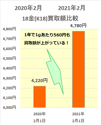 1gあたり560円と聞くと、それほど買取価格に差を感じない方もいるかもしれませんが、例えば18金のジュエリーが合計100gあったとして、一年前と現在と比べると