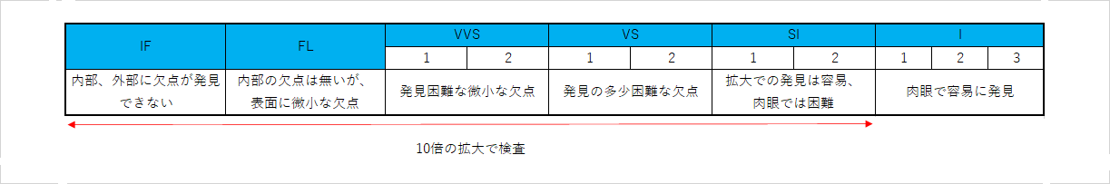 自然界で生成されるダイヤモンドには、当然亀裂や不純物が混じっている事が多く、宝石としてはそういった内包物が無い方が高値が付きます。10倍に拡大した時に、どの程度の内包物が見えるのかを、人間の目で見てグレードを決定します。