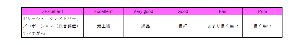 ラウンドブリリアントカットである場合にのみ出すグレードです。ポリッシュ(研磨状態)、シンメトリー(対称性)それぞれの評価と、その総合判断で決定されます。