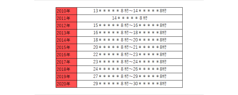 こちらが、シリアルナンバーと製造年を示した表になります。完全に一致するわけではなく、少しズレがありますのでご注意ください。8桁になったのは2005年頃からで、それ以前は7桁のシリアルナンバーになっていました。