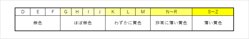 カラーは色です。通常のダイヤモンドは無色透明である程質が良く、黄色味を帯びて行く程に質が悪いと判断されます。