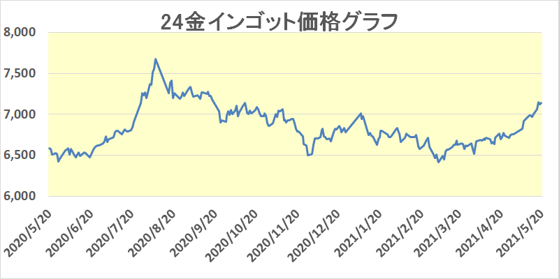 参考までに、過去1年の24金インゴット買取相場を比較したグラフをご覧ください。