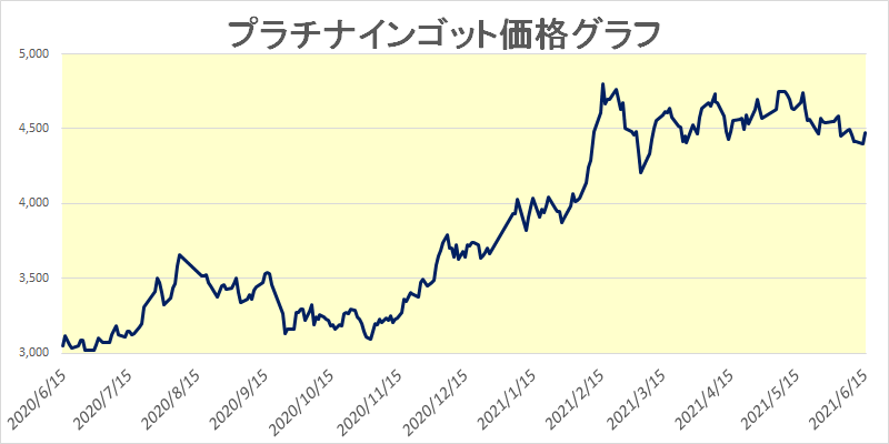 プラチナは昨年の12月から相場が上昇し、この記事を書いている2021年7月15日時点ではPt950の買取相場は3,810円/gとなっています。