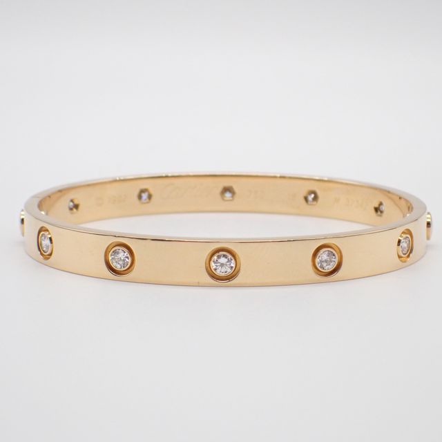須賀質店五反田本店でカルティエのラブブレスを買取いたしました。人気のラブシリーズの中でも人気の高いブレスレットですが、今回は旧型の人気のイエローゴールド、サイズも20と大きかったので高価買取査定となり360,000円でのお取引となりました。 【目次】カルティエのジュエリーについて カルティエのラブブレスを高く買取してもらうにはどうすれば良い? カルティエのラブシリーズについて 今回買取のラブブレスについて カルティエ ラブブレス イエローゴールド 旧型を買取まとめ カルティエのジュエリーについてカルティエのジュエリーは数多くあるブランドジュエリーの中でも非常に人気が高く、業者間で行われる古物市場に出品されるブランドジュエリーの中では一番多いメーカーだと思います。カルティエの次にブルガリ、ティファニーなどが続きますが、カルティエが他を圧倒しているように感じます。 カルティエは世界五大ジュエラーの一つに数えられていて、カルティエ以外だとハリーウィンストン、ヴァンクリーフ&アーペル、ティファニー、ブルガリとあります。どれも非常に定価も高く、また品質も非常に高く、また中古市場に出回った時も高値で流通しますので、高価買取が可能となるメーカーです。 カルティエのジュエリーの中でも高値で売れるものと比較的安くなってしまうものなどあり、つまり人気のあるシリーズ、不人気のシリーズがあるということですが、ここ数年高値で取引されているのがジュストアンクルシリーズです。 ジュストアンクルは釘をイメージしたデザインのもので、リング、ブレスレット、ピアス、ペンダントネックレスなど色々発売されています。ダイヤ付きのものなどもありますが、どれも非常に高値が付くほど非常に人気があります。人気がある分コピー品も多く出回っていますのでご購入の際にはご注意ください。 カルティエのラブブレスを高く買取してもらうにはどうすれば良い?このページに訪問していただいた皆さんは、カルティエのブランドジュエリーを高く買取してもらう方法、少しでも高く売る方法を探していると思います。では、カルティエのラブブレスを高く買取する具体的な方法はどうすれば良いでしょうね。 実は、ラブブレスに限ったことではありませんが、カルティエのブランドジュエリーには多数の種類が有ります。このページの後半でも触れていますが、ラブブレスを例にすれば、新型と旧型、カラーや素材、ダイヤが取り付けられているかどうか、また、ダイヤもフルダイヤのタイプなのかハーフダイヤのタイプなのか、パフェダイヤが付いたタイプなのかと、たくさんの種類が有るのです。 ①型式:新型と旧型がある ②カラーや素材:ホワイトゴールド(銀色) イエローゴールド(金色) ピンクゴールド(赤みがかった金色) ③ダイヤの付き方:ハーフダイヤタイプ(ダイヤがひとつおきについている)フルダイヤタイプ(ダイヤがすべてのポイントについている)パフェダイヤ付き(細かいダイヤモンドで埋め尽くされている) カルティエのラブブレスを高く買取してもらうには、これら多数の種類のラブブレスの相場価格を把握して買取の実務に生かしている質屋や買取店に相談するべきだと思います。カルティエラブブレスをはじめブランドジュエリーは、以前はホワイトゴールドの方が高価買取査定がされていましたが、最近ではイエローゴールドの方が査定価格が高くなって、逆転しています。 こうした時代の流行を的確にとらえて、質入れや買取の査定の現場に生かしている店舗に相談することが、少しでも高く買取や質入れを実現するコツと言えるでしょう。買取や質入れを検討している品物が有れば、電話やメール、Line等を使って問い合わせをすることから始めることをお勧めいたします。 カルティエのラブシリーズについてカルティエのラブシリーズはビスのようなデザインでこちらもリング、ブレスレット、ピアス、ネックレスなど多くの製品が出ています。色もホワイトゴールド、イエローゴールド、ピンクゴールドがあり、稀にプラチナを使ったものもあります。 リング、ブレスレットなど問わず現在高値で取引される人気の色はピンクゴールドで、次がイエローゴールド、ホワイトゴールドは定価は一番高いですが、中古市場に出回るときには安くなってしまいます。しかし、これは流行によるものなので、今後どうなるかは全く分からず、実際に数年前まではホワイトゴールドの方がイエローゴールドより高かった時期がありました。 ダイヤ付きのものに関しては、ラブシリーズの特徴であるビスモチーフの部分にダイヤを付けているモデルと全体にパヴェダイヤ付けているモデルがリング、ブレス、ネックレスにそれぞれあり、パヴェダイヤのものは非常に高値になってきます。 今回買取のラブブレスについて今回買取のラブブレスはイエローゴールドのタイプでダイヤは付いていないものでした。サイズは20と大