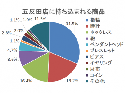 よく預けられている品物は、質屋の買取の品物にも同じような比率で当てはまっていて、須賀質店五反田本店の買取の品物も、貴金属、時計、バッグの比率高くなっています。