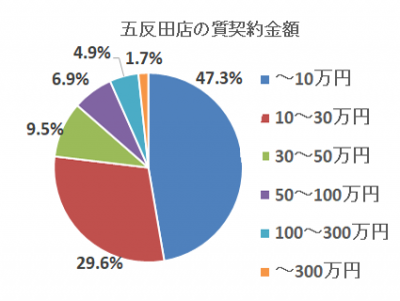 須賀質店五反田本店で借り入れされている金額は、30万円以下の借り入れ金額が多くて、五反田本店の質契約の8割弱が30万円以下の質契約です。ただし、お客様によっては複数の質契約を結んでいる方もいらっしゃるので、一人当たりの借入額と質契約の借入額は同じではありません。