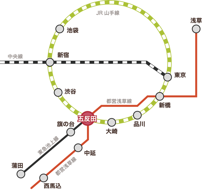 五反田駅には駅隣接型の商業施設「レミィ」が営業していて東急池上線が五反田駅から蒲田駅までを結んでいます。